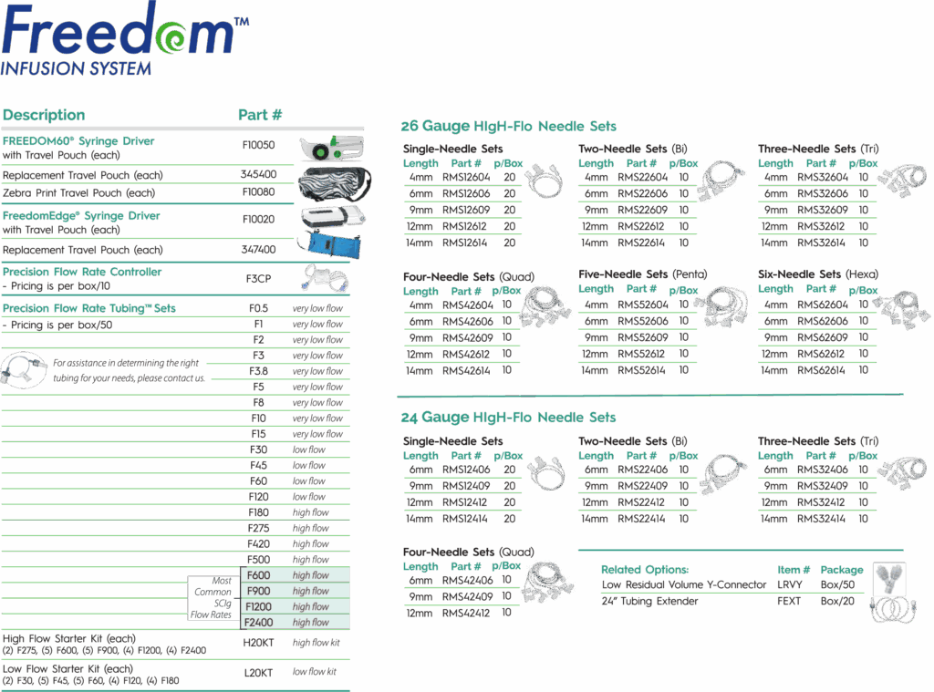 If a dose is larger than 50 ml, you can load an additional BD® 50 ml syringe using the same tubing and needle set. Follow your healthcare provider’s protocol for swapping out the syringe. For smaller volumes, the FREEDOM60® will adjust to whatever amount is contained in the syringe. The syringe can be filled anywhere from a full 50 ml to as little as 1ml. You can also try our FreedomEdge®, which accommodates both 20 and 30 ml syringes.